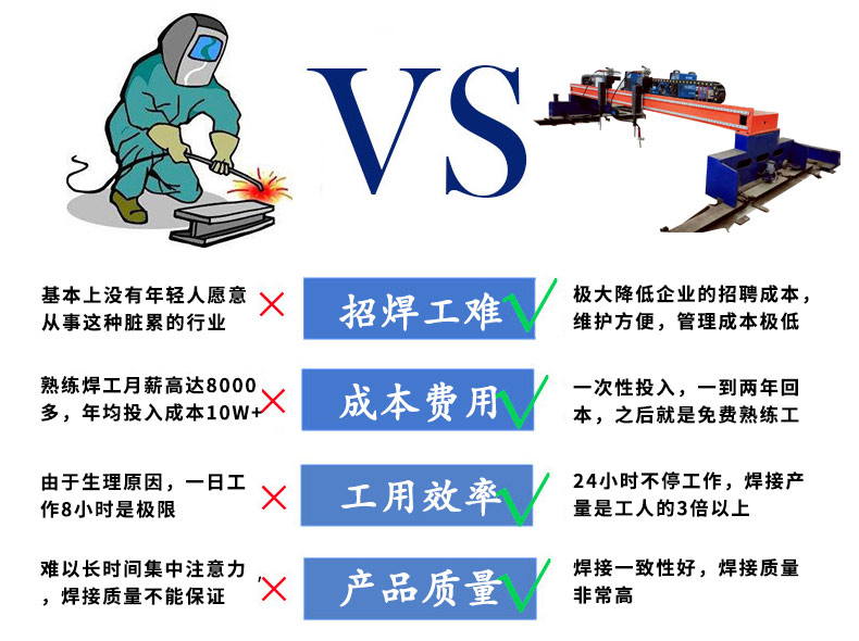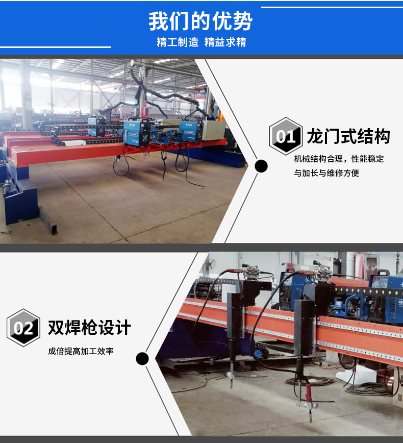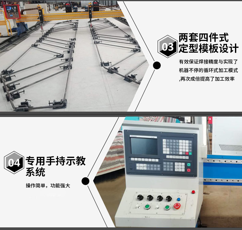 獨(dú)創(chuàng)的龍門式結(jié)構(gòu);機(jī)械結(jié)構(gòu)合理,性能穩(wěn)定與加長(zhǎng)與維修方便;雙焊設(shè)計(jì);成倍提高加工效率;兩套四件式定型模板設(shè)計(jì);有效保證焊接精度與實(shí)現(xiàn)了機(jī)器不停的循環(huán)式加工模式;再次成倍提高了加工效率。公司開發(fā)的焊接機(jī)器人專用手持示教系統(tǒng):操作簡(jiǎn)單,功能強(qiáng)大。